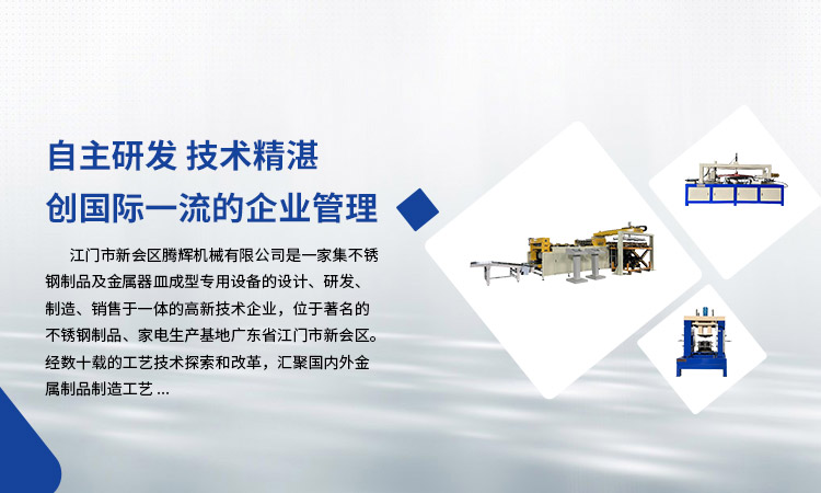 江門市新會區(qū)騰輝機械有限公司是一家集不銹鋼制品及金屬器皿成型專用設備的設計、研發(fā)、制造、銷售于一體的高新技術企業(yè),位于著名的不銹鋼制品、家電生產基地廣東省江門市新會區(qū)。經數(shù)十載的工藝技術探索和改革,匯聚國內外金屬制品制造工藝。